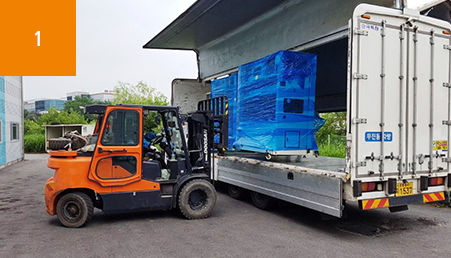 공장내 환경에 맞추어 중량물 장비를 이용하여 실내반입작업 진행